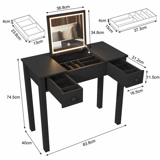 Black Vanity Desk with Flip-Top LED Mirror , Small Makeup Table with 2 Drawers & Storage for Bedroom