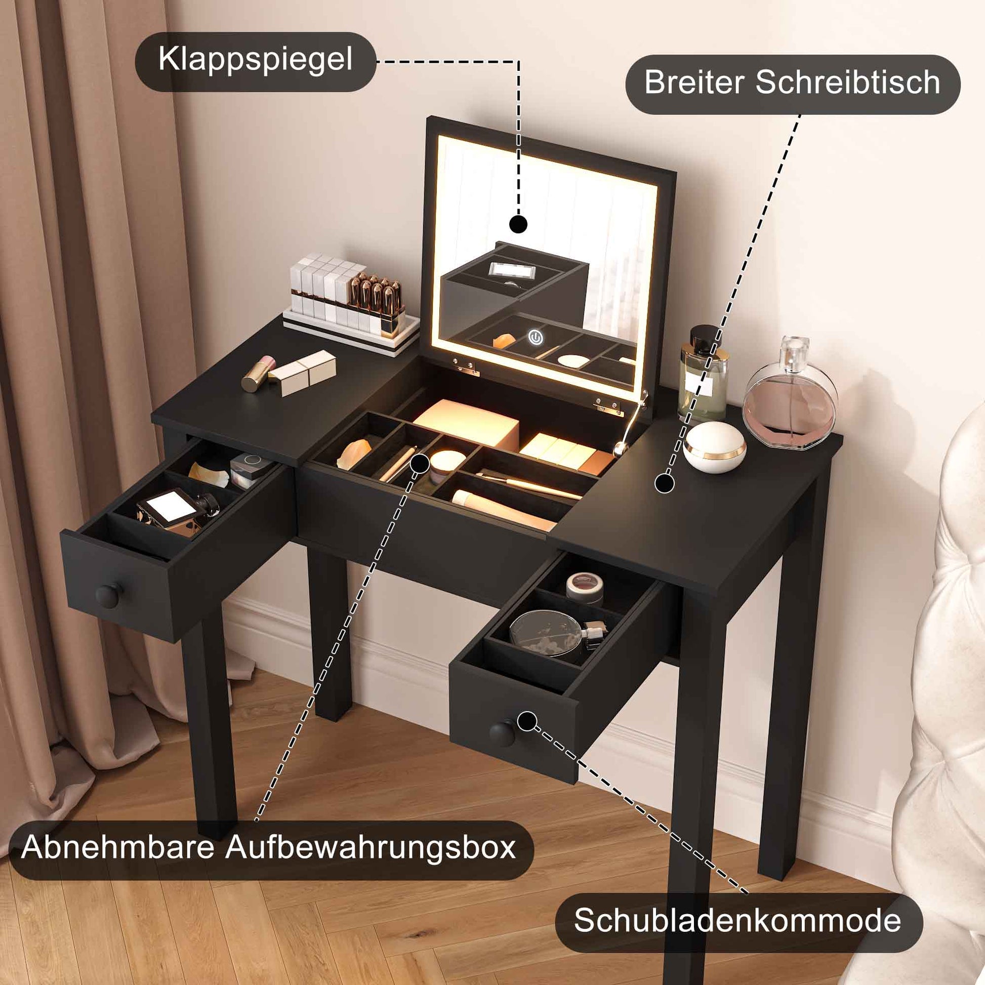 [Ample Storage Movable Space]: This vanity desk features two drawers plus a spacious storage compartment, providing enough space for your jewelry, perfumes, and other small items to keep your desktop clean and organized. The three built-in containers are also movable.