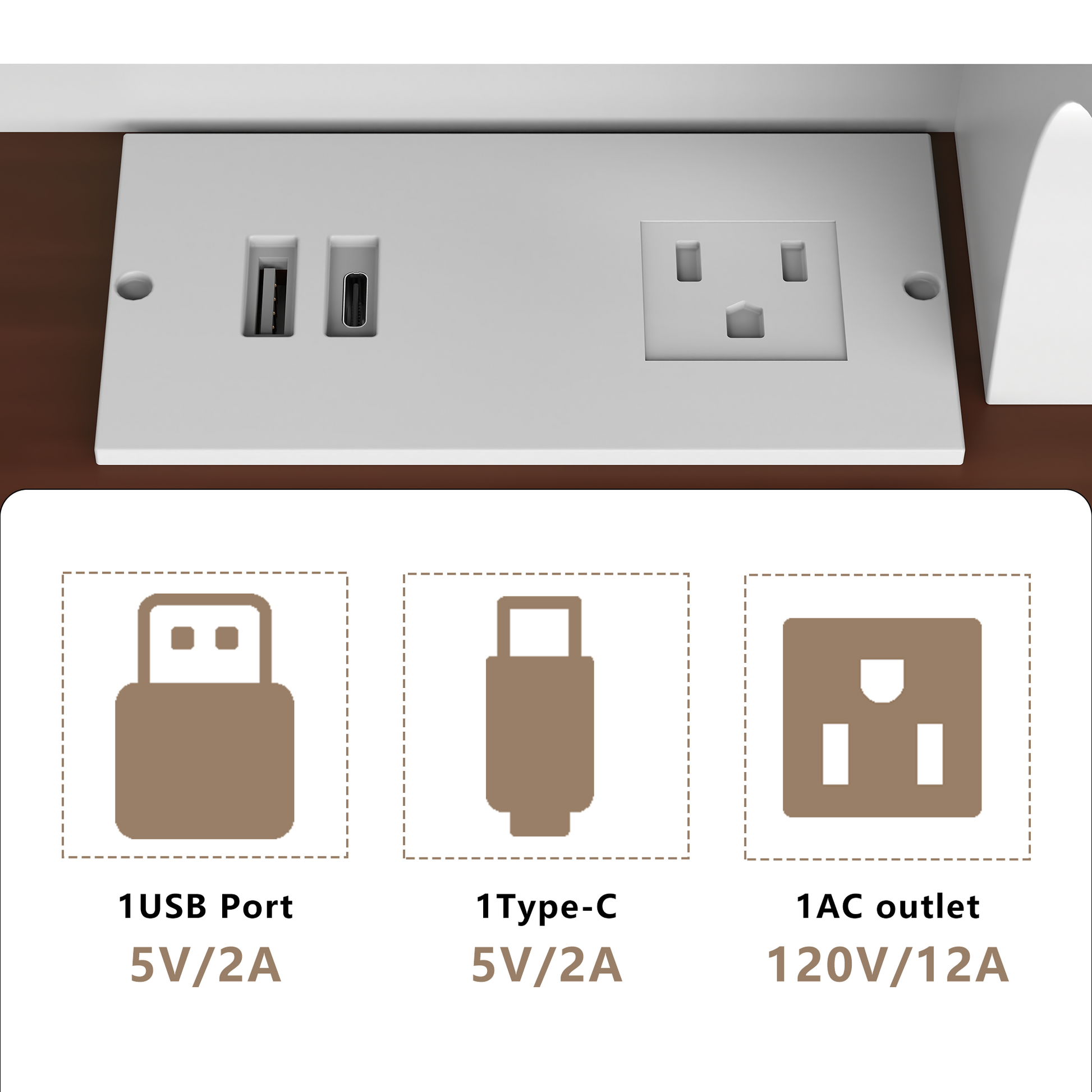 - Adjustable Lighting and Built-in Power Strip: Vanities Desk with built-in power strip include a USB port and Type-C port, one standard plug socket, making it very convenient for you to charge your phone, headphones, use Hair dryer and other electronic. The LED mirror has 3 different color modes, while the brightness can be adjusted by touch button to meet different brightness needs.