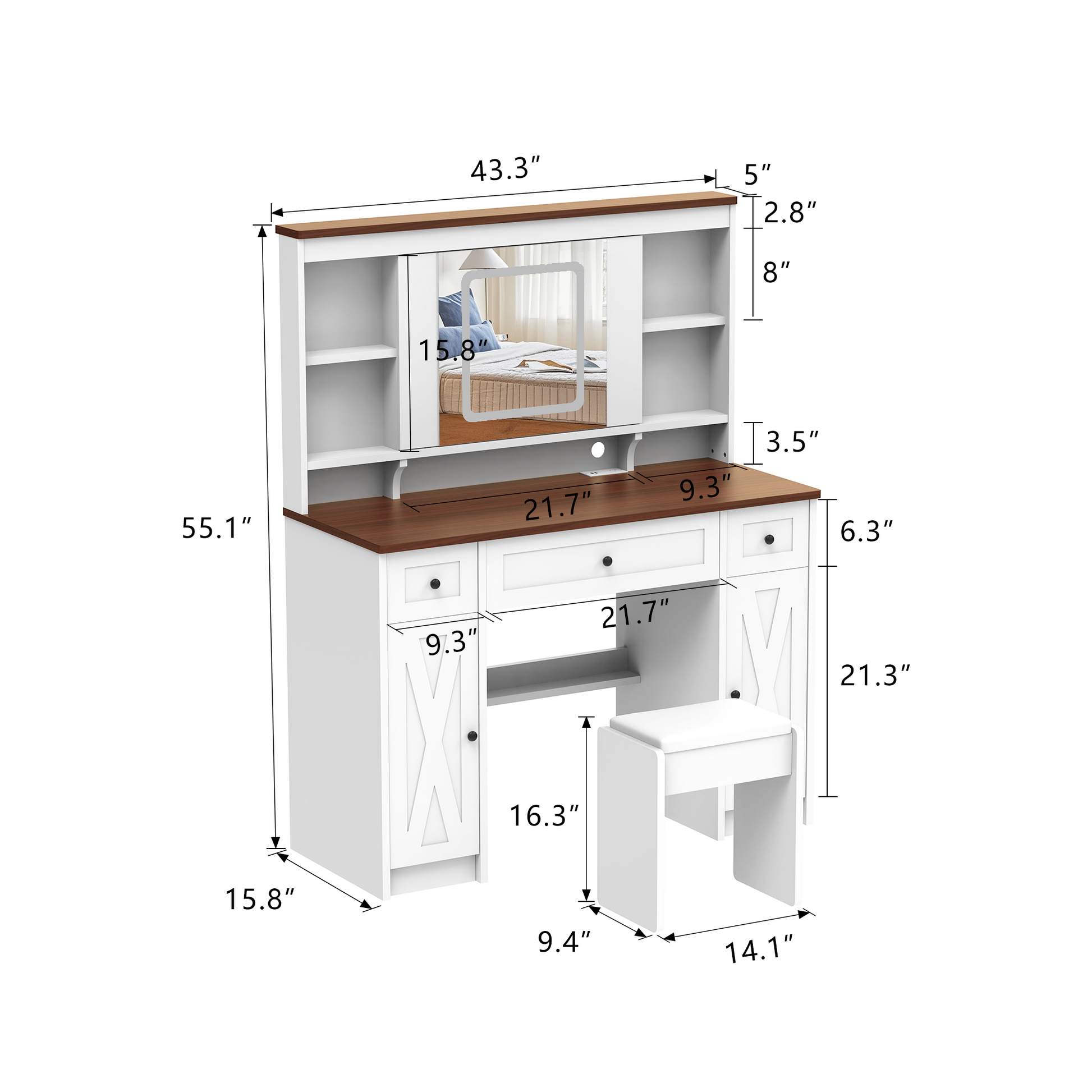 Farmhouse Vanity Desk with Sliding Mirror,Lights and Charging Station,Makeup Table Desk with Dimmable Led Light,Vanity Makeup Table with Sponge Soft Stool,White+Brown Finish