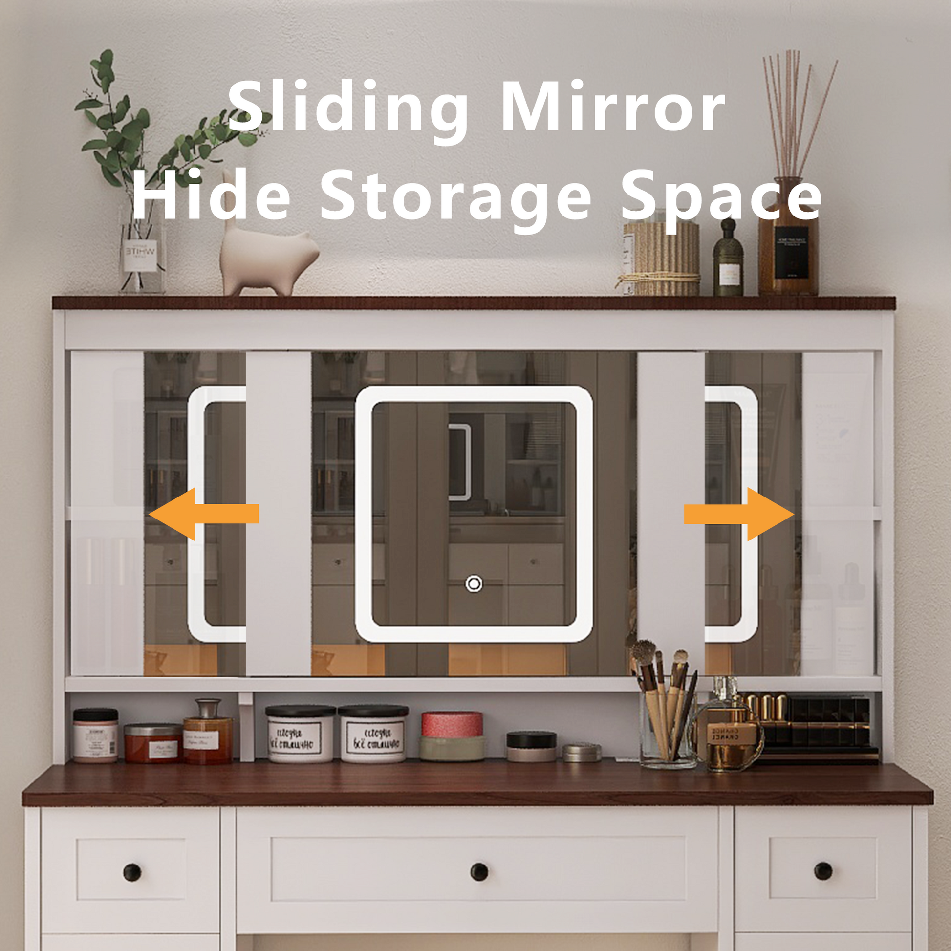 - Sliding Mirror: The mirror is mounted on a sliding rail, allowing it to move freely, making it convenient for use while applying makeup. Additional storage space is available behind the mirror.